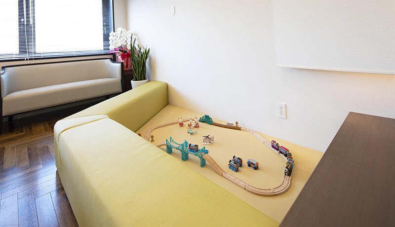 機関車トーマスの木製レールセットに、シルバニアファミリーのお医者さんセットを用意し、森の温もりをイメージいたしました。つらい症状のお子さんも、来るのが楽しいと思えるような、そんな場所でありたいです。